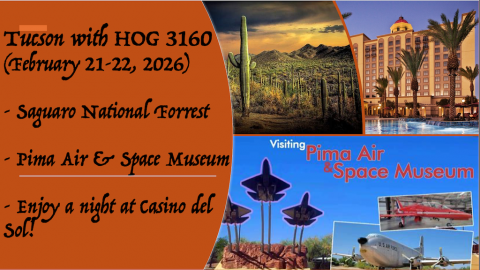 Join your HOG 3160 friends on an overnight trip to Tucson February 21-22, 2026. We’ll enjoy a scenic ride down with lunch along the way to ride through the eastern portion of the Saguaro National Forrest ($20 entry fee per motorcycle – pay in advance at https://www.recreation.gov/sitepass/2917).
